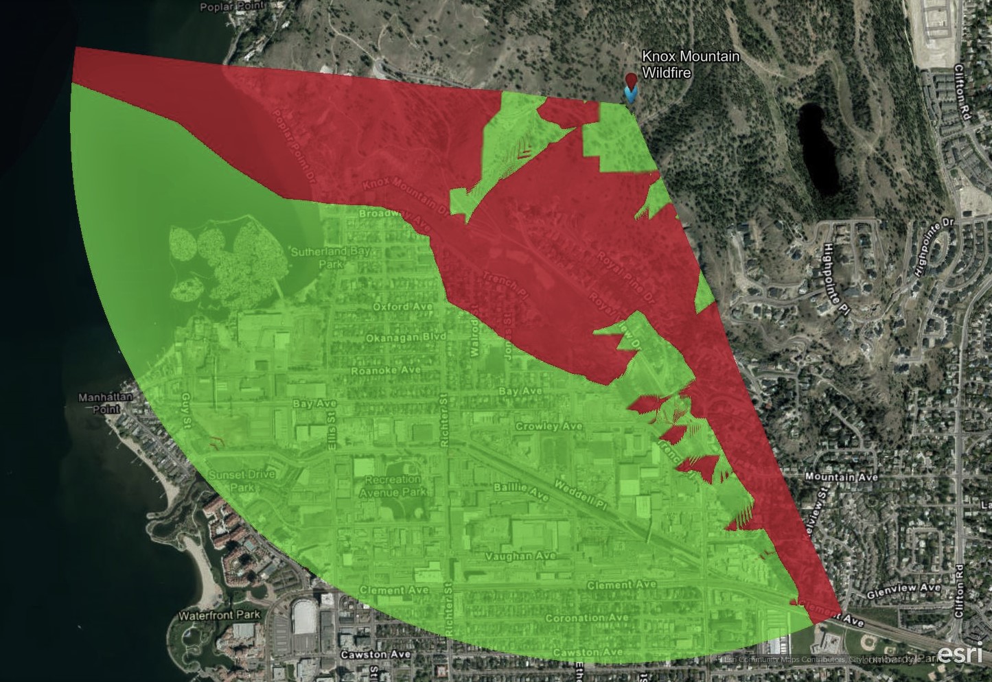 Kelowna RCMP released a map of the Knox Mountain area. Areas shaded in green are considered places with direct sightlines of the fire. Police say the public could potentially have video footage of any suspicious activity. Areas in red were not within the fire’s sightlines.