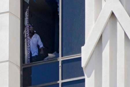 The hours-long standoff reached its most dramatic point when a room window shattered and frightened guests were evacuated from the pool below as furniture and other objects fell from the unit on the 21st floor.