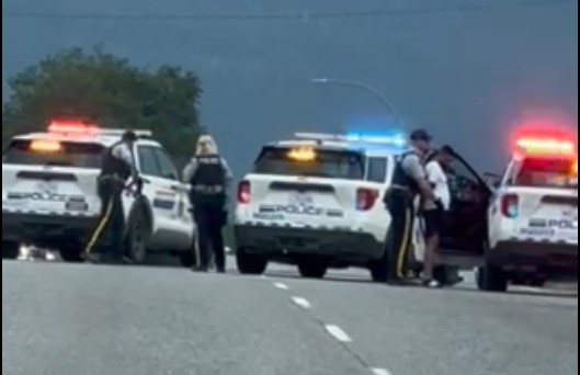 In a video submitted to Global Okanagan, a man can be seen being arrested by police, who had their guns drawn, on the side of Highway 97.