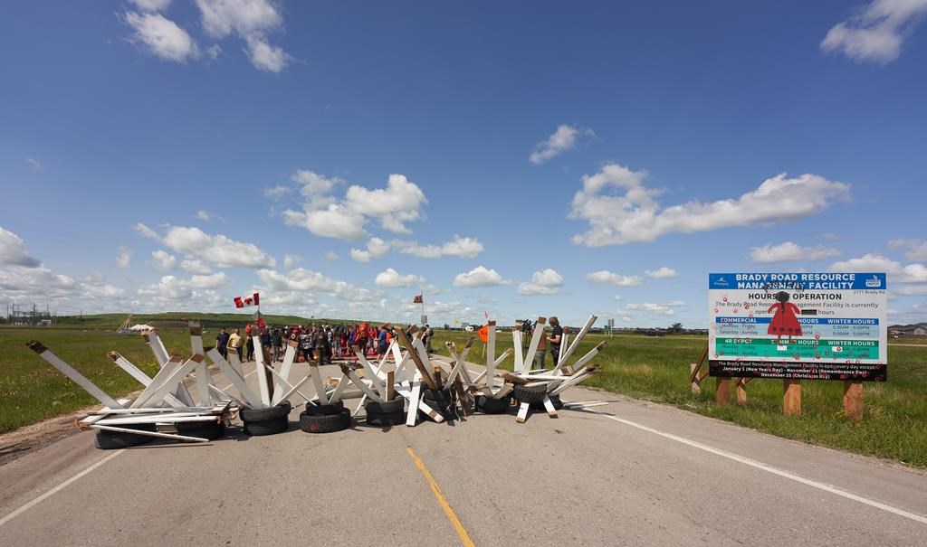 Protesters erected the barrier after Premier Heather Stefanson said the province would not support a search of the privately-owned Prairie Green landfill north of the city for the remains of Morgan Harris and Marcedes Myran, believed to be killed by Jeremy Skibicki.