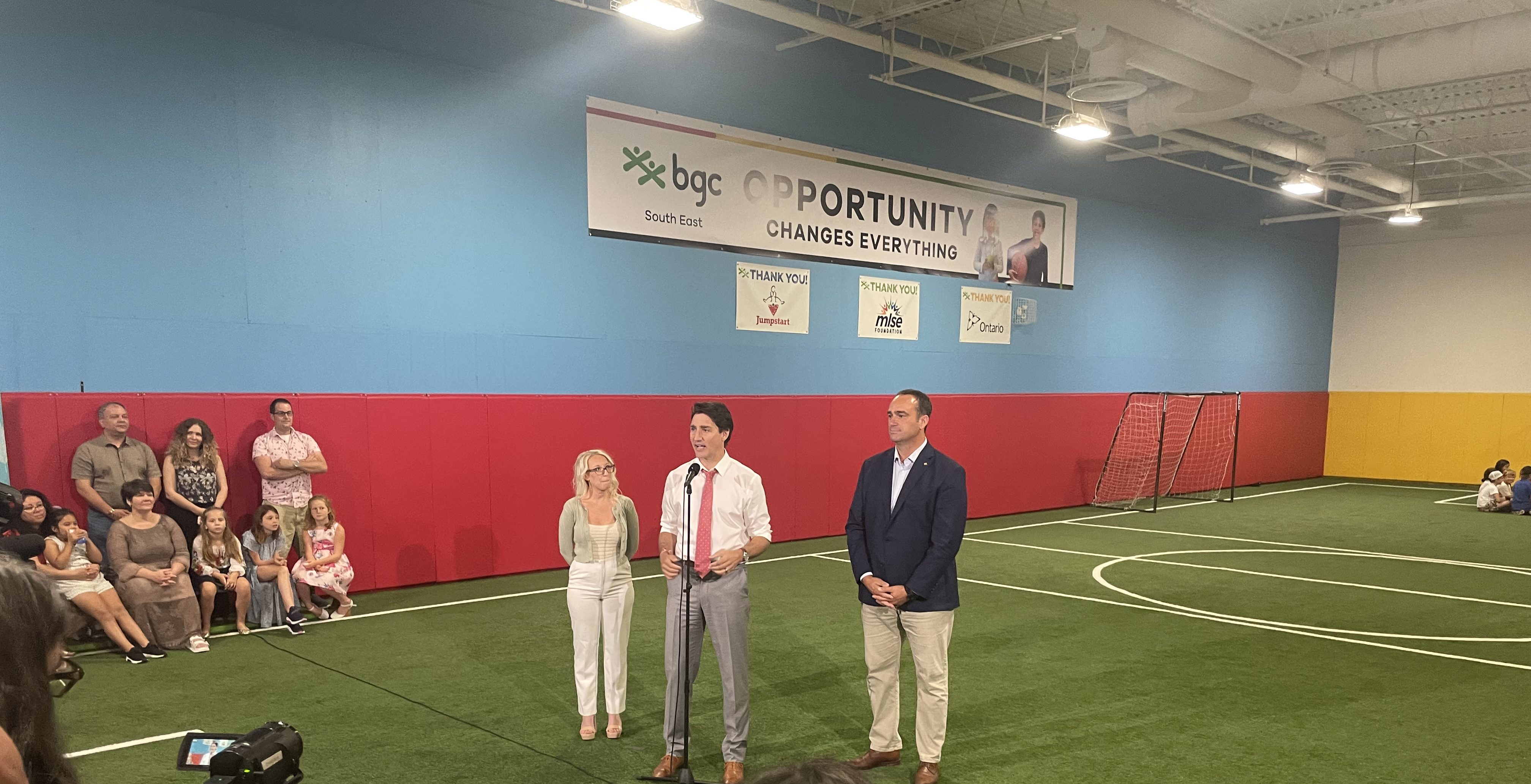 The prime minister visited the city’s west-end Boys and Girls Club on Bath Road, where he shook hands with parents and high-fived kids.