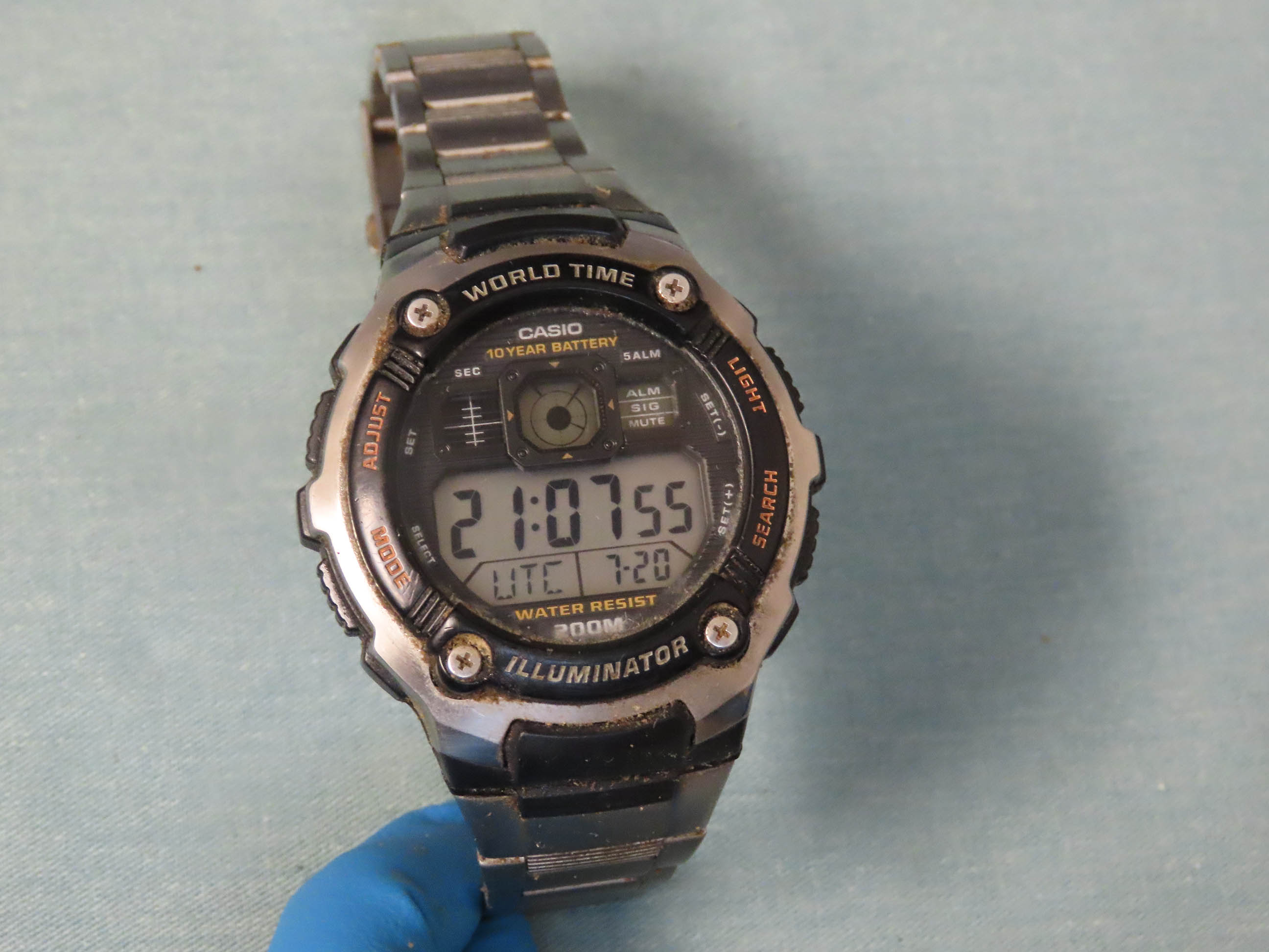 He was wearing a grey hoodie, grey pants, hiking boots and a watch, and police say a red and black hockey bag was found nearby containing work gloves, a tilly hat, glasses, a switchblade and a hunting knife in a sheath.