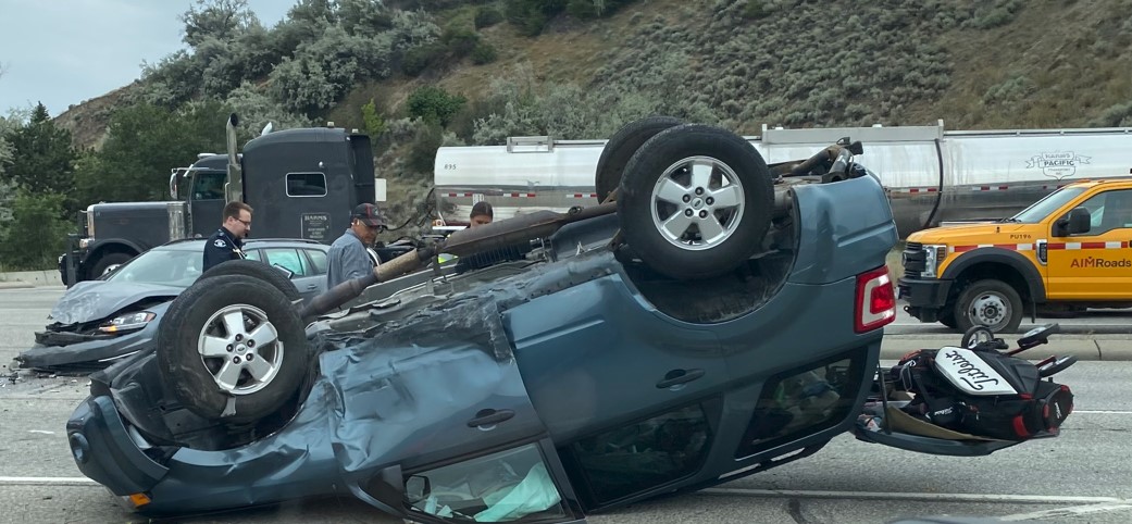 A two-vehicle crash near Summerland, B.C., backed traffic up along Highway 97 as crews worked to clear the damage.