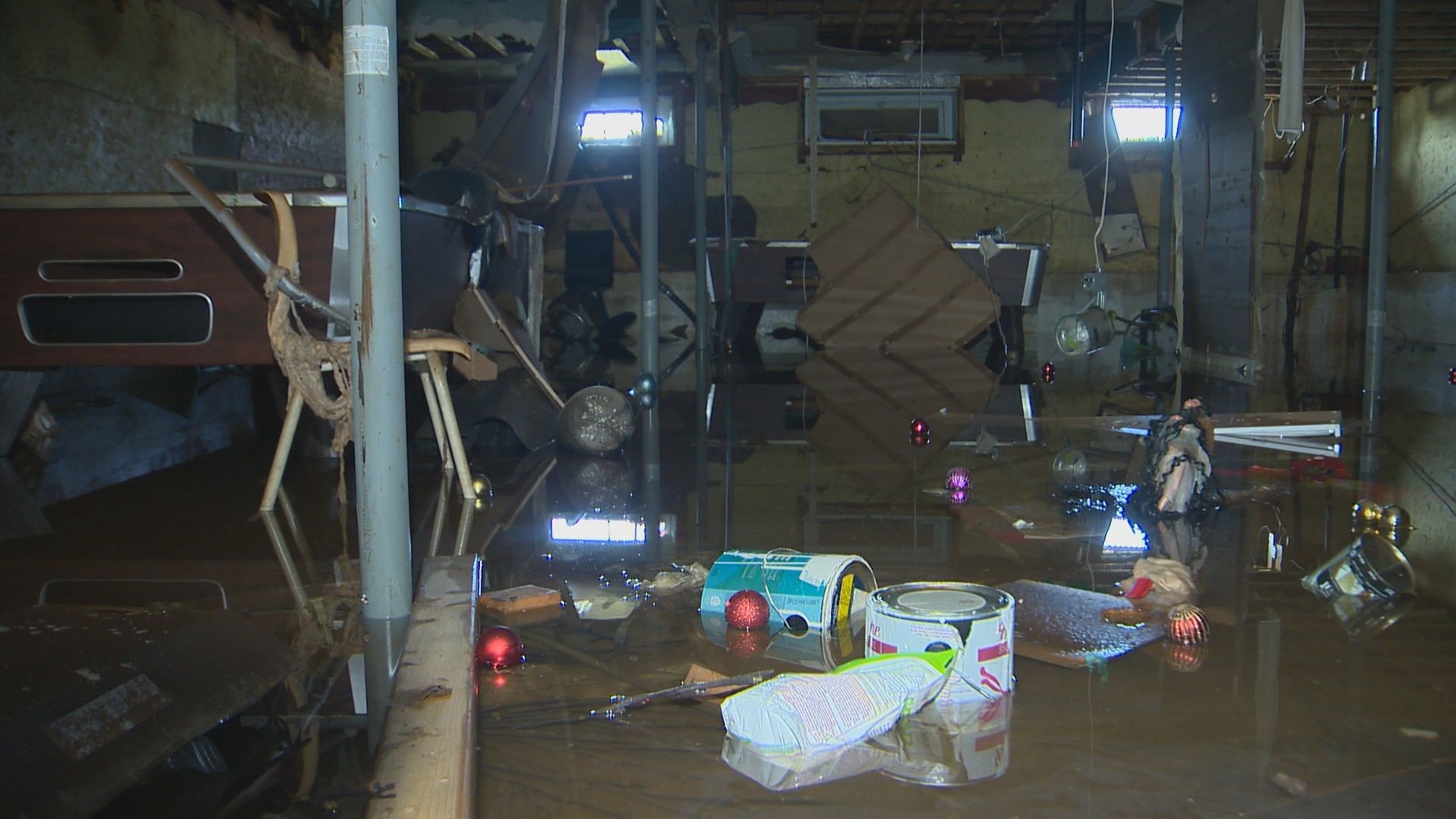 While a pump has been trying to drain the murky water, the local fire department was able to get to a point where items could begin to be salvaged. The small pump is chugging away in a basement crammed with chairs, pool tables, and Christmas decorations, not to bits of the flood-damaged ceiling and drywall.