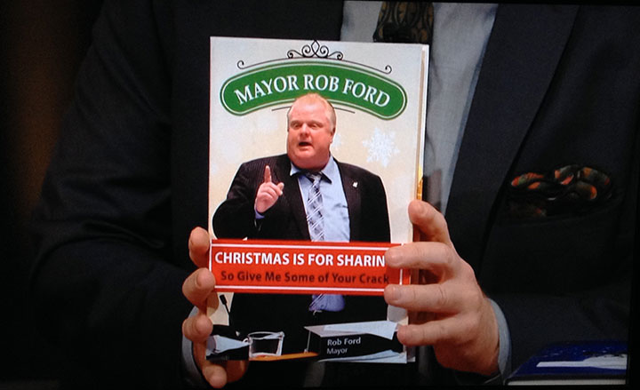 In a segment where he showcased some phoney holiday-themed books from politicians, he held up a book by Rob Ford entitled Christmas is for Sharing, So Give Me Some of Your Crack.