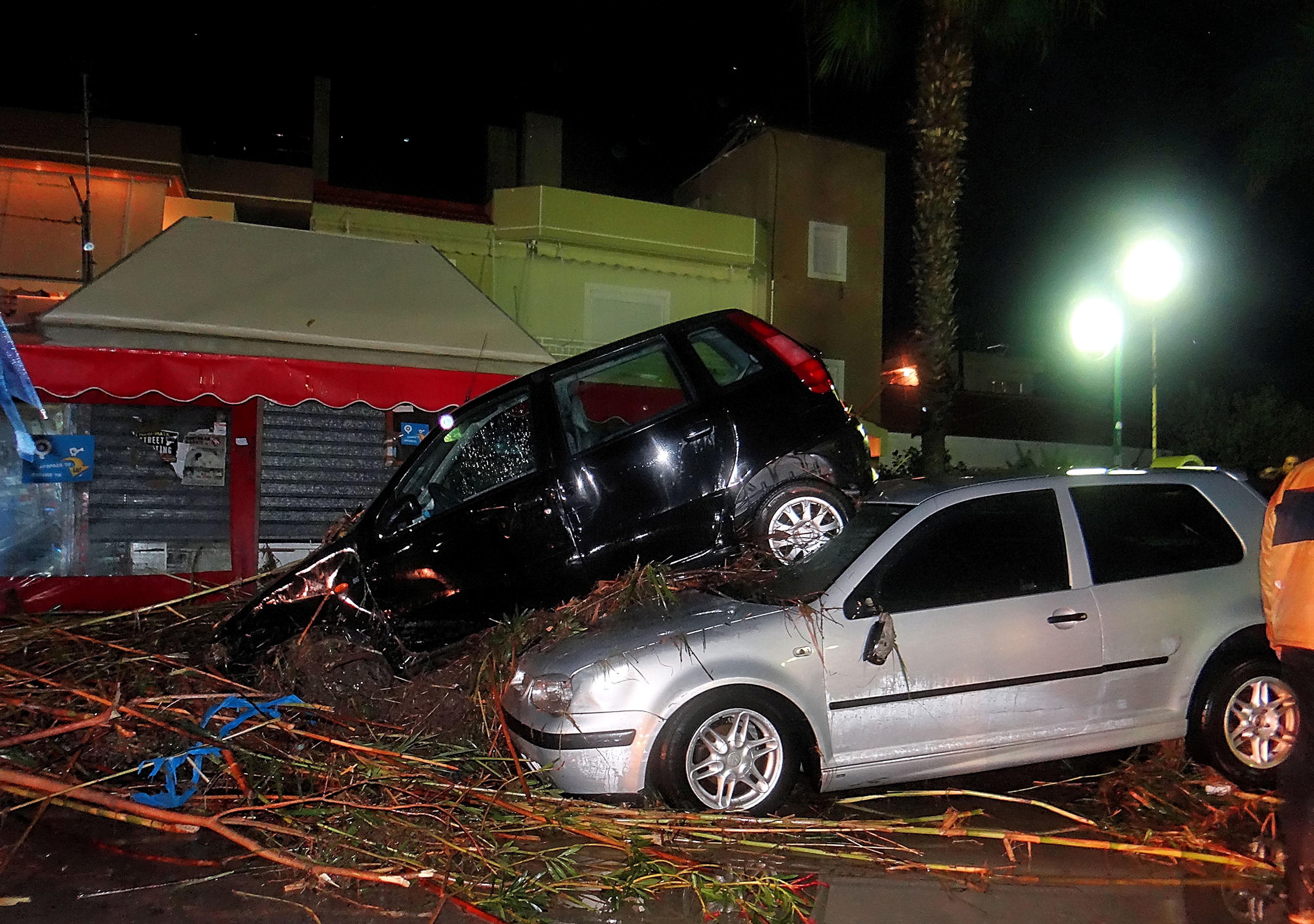 The storm hit the island Friday evening and caused flooding, with hundreds of people trapped in cars, the island’s firefighting brigade says.