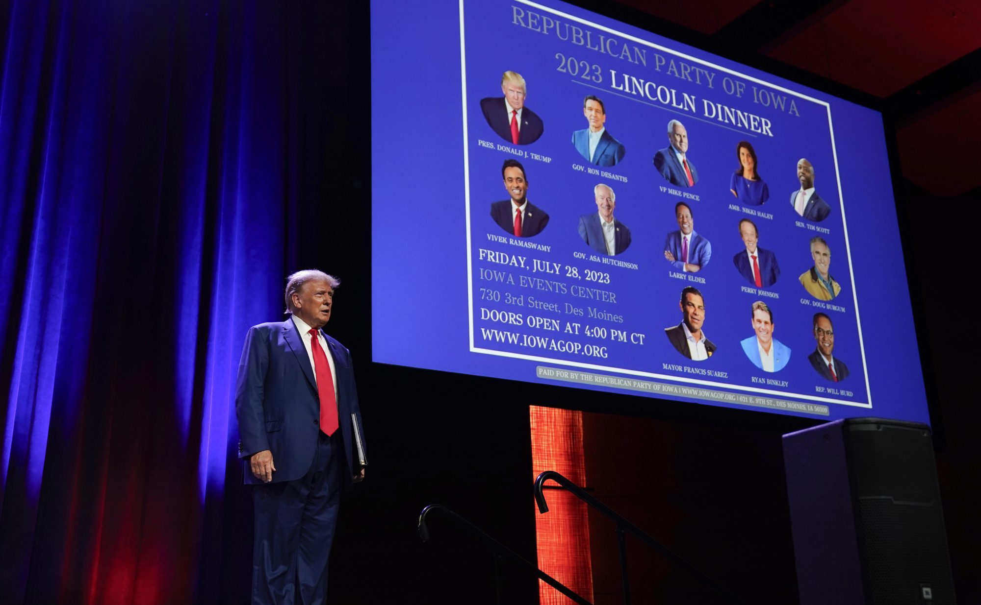 DeSantis, who like most of Friday’s speakers vowed to visit all of Iowa’s 99 counties, is Trump’s strongest primary competitor but has been trying to reset his stalled campaign for two weeks. He’s increasingly focusing on Iowa in its efforts on trying to derail Trump, and spoke at the dinner in the midst of a two-day bus tour of the state.
