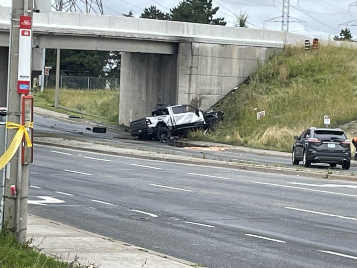 Toronto police said that just after 2 p.m. a pickup truck crashed into a bridge around Dixon Road and Martin Grove Road.