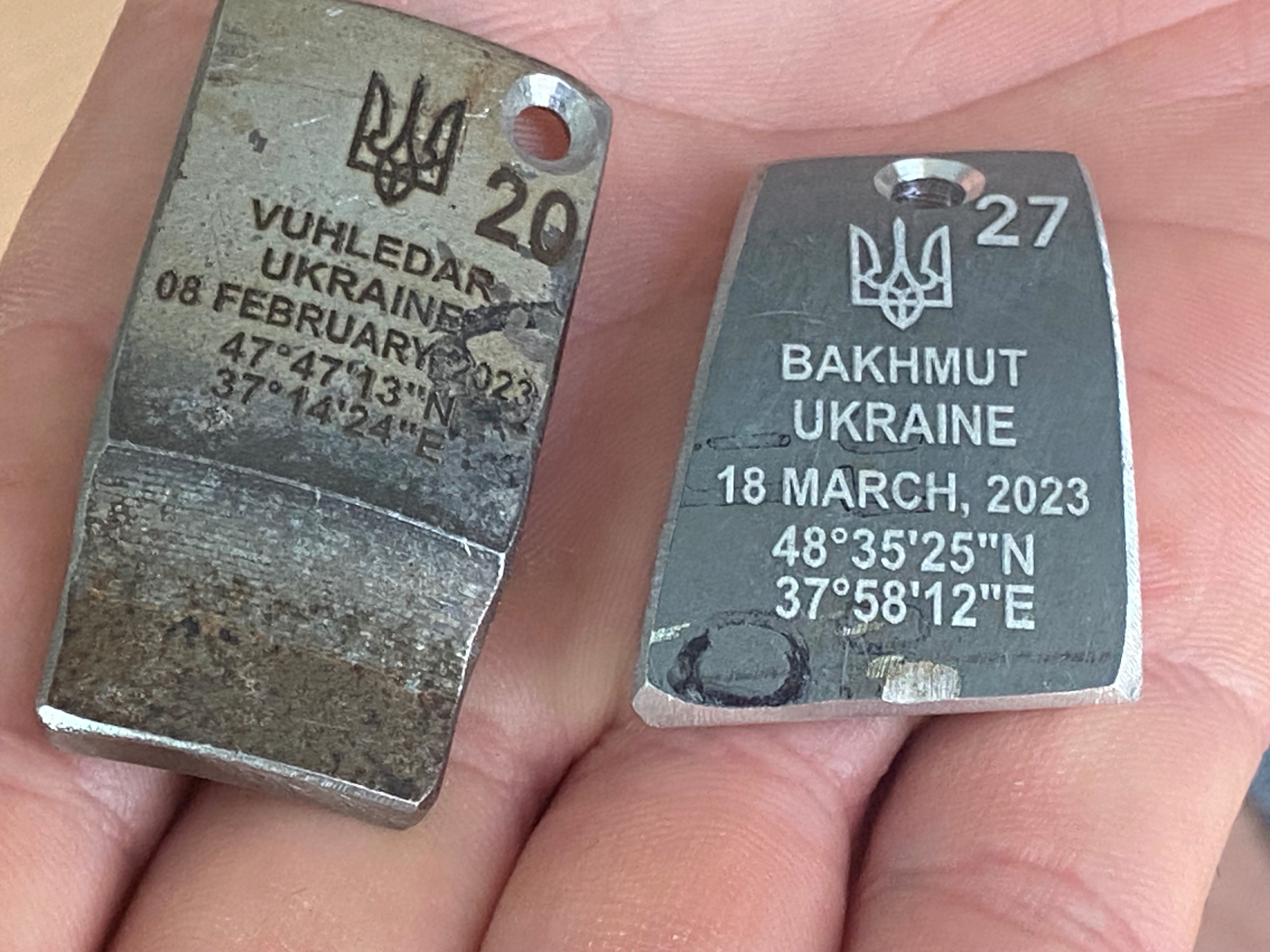 He’s also selling key chains made from bits of Russian rockets that landed on Ukrainian soil, converting Russian weapons into money for drones. He points to one that was from Bakhmut, which has information engraved on it like the date and the GPS coordinates from where it was found.