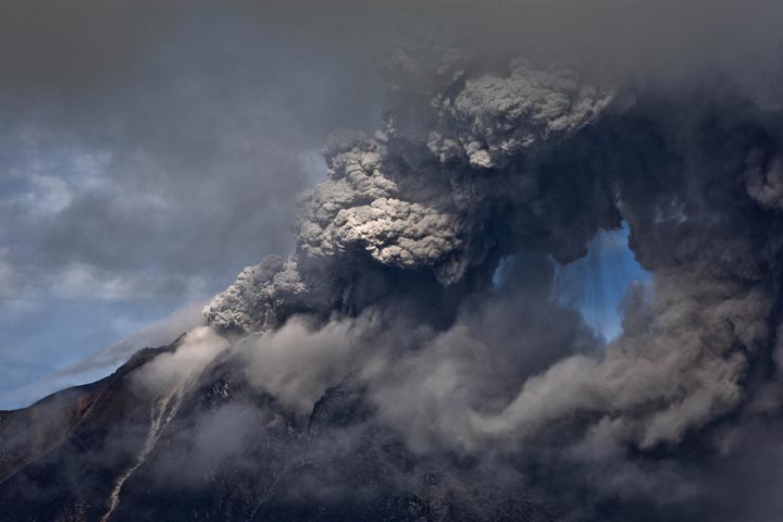 Six new eruptions in the morning sent lava and searing gas tumbling up to 1.5 kilometres (.9 miles) down the slopes of Mount Sinabung in North Sumatra province. Volcanic material spewed as high as 2,000 metres (6,500 feet) into the air a day after authorities had raised the volcano’s alert status to the highest level.