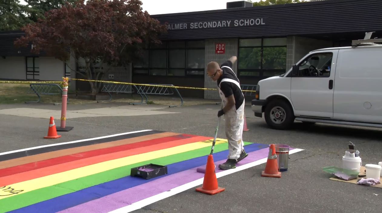 The rainbow crosswalk was first installed at R.C. Palmer Secondary School on Tuesday, Aug. 1, and was vandalized that night. School district staff repainted it Wednesday, only for it to be vandalized twice more.