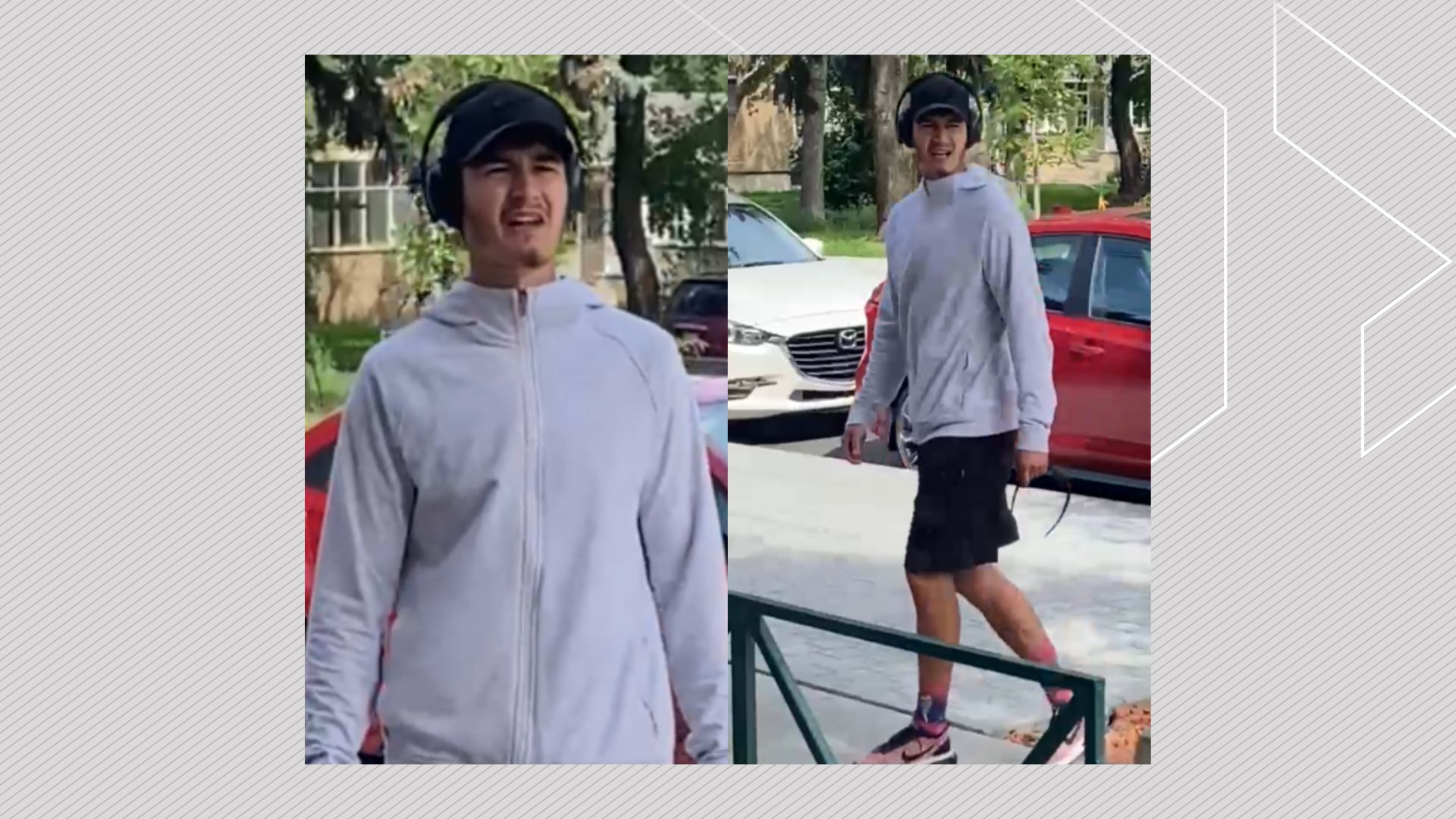 He is described by police as a man between 20 and 30 years old with a slim build, black medium-length hair and some black facial hair. He was wearing a black hat, black headphones, black shorts, a grey zip hoodie, pink and blue socks, and black and pink running shoes.