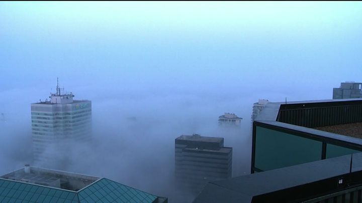 Fog is seen in downtown Edmonton on Aug. 25, 2023. Global News' Skytracker Camera