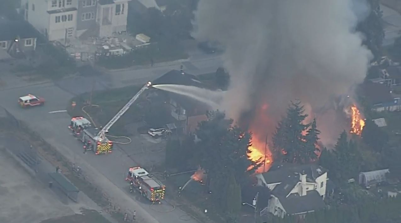 Large flames lit up a Surrey, B.C., neighbourhood Friday morning as a large family home burned to the ground.