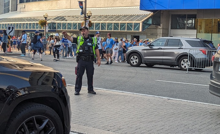 A Toronto police officer has been injured after being struck by an erratic cyclist in Toronto’s Entertainment District on Sunday afternoon.