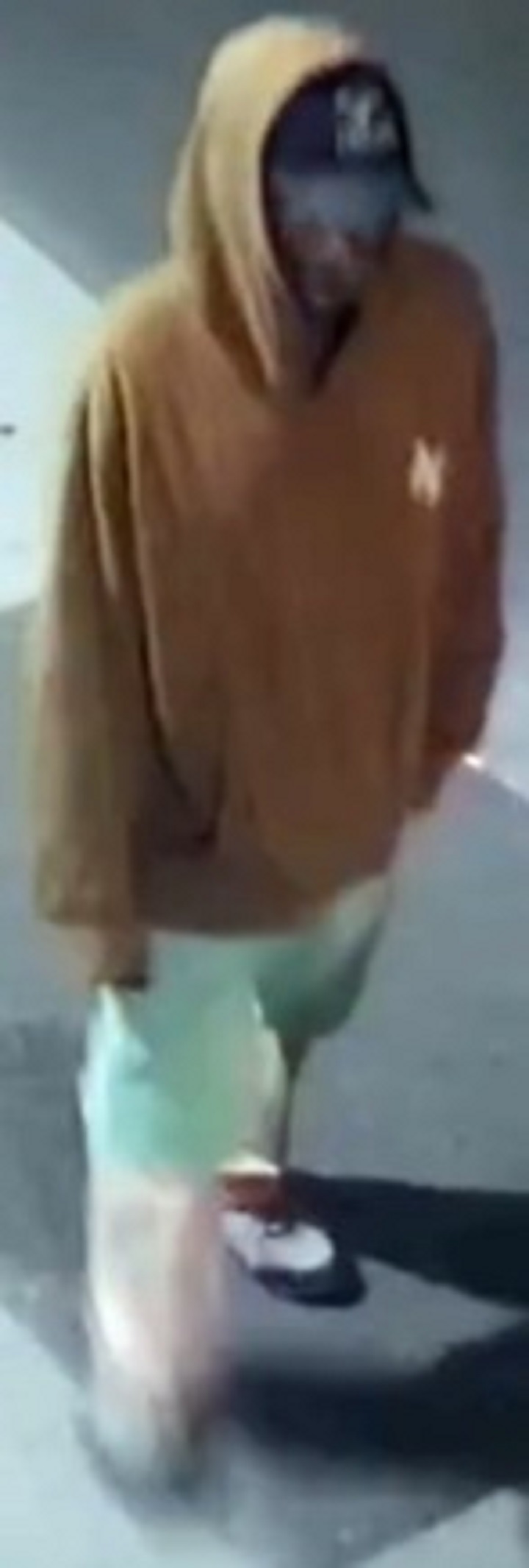 He was reportedly wearing an oversized beige American Eagle hooded sweater and light green shorts over a pair of pants.