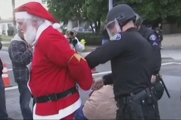 Police responded to the scene and declared an unlawful assembly. Santa was then handcuffed and taken away. “It’s all for the kids, kids need a place where they can have a family that gets a decent wage”, said Santa as he was led away by police.