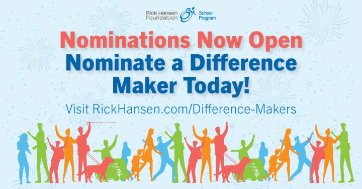 Difference Maker of the Year AwardsThe Rick Hansen Foundation School Program Difference Maker of the Year Awards celebrate and recognize youth, youth groups, and classrooms from ages 5 to 18. Our award recipients are leaders in making a positive impact for inclusion and accessibility for people with physical disabilities in their school and community. Nominations for the 2023-2024 school year...OtherJan 1 - Apr 7
