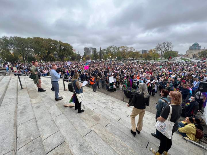 Rally at Manitoba legislature supports youth transgender rightsA massive crowd supporting youth trans rights rallied outside the the Manitoba legislature Sunday after a "1 Million March for Children” protest was held there a few days earlier.CanadaSep 24, 2023