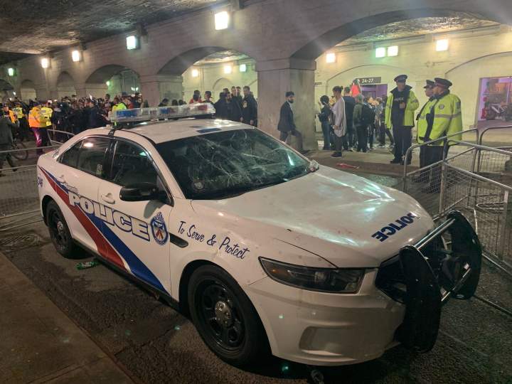 Youth arrested, 7 still wanted after Toronto police car damaged in Raptors celebrationsPolice said the suspect turned himself in and has been charged with mischief under $5,000, but cannot be identified because he is under the age of 18.CrimeJul 2, 2019