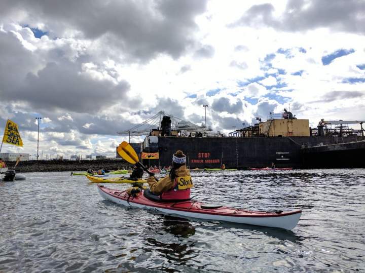 Kayakers paddle into Port of Seattle to protest Kinder MorganAbout 30 activists with the group Mosquito Fleet surrounded an oil barge to protest the Trans Mountain pipeline and tanker project.EnvironmentMar 18, 2018