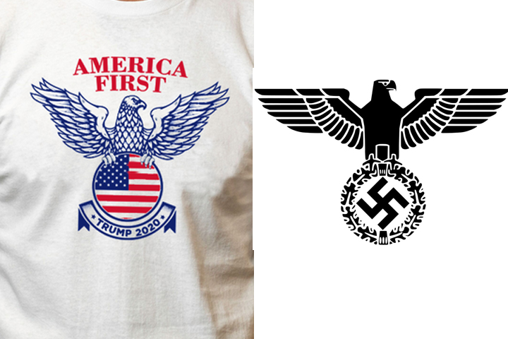 Trump 2020 campaign accused of ‘ripping off’ Nazi eagle logoCritics say the Trump campaign's new 'America First' logo resembles the infamous Nazi war eagle, with a flag in place of the swastika.TrendingJul 2, 2020