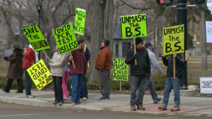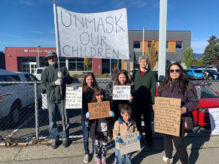 COVID-19: Anti-mask protest outside Kelowna, B.C. school board office draws small crowdProtesters held signs that read "unmask our children," "mandatory masks have no place in schools," "children not politics" and "I can't breathe."HealthOct 6, 2021
