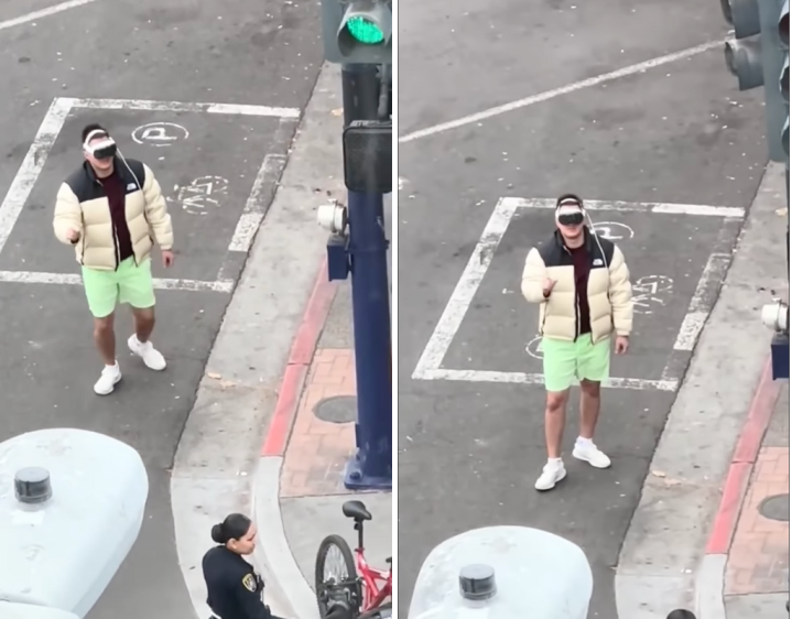 Video of man wearing Apple Vision Pro while crossing road prompts police warningThe video shows a man gesturing in the air while wearing the US$3,499 augmented reality goggles as he crosses the street.TechFeb 21, 2024
