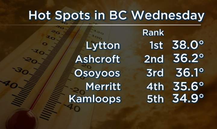 12 temperature records broken in B.C. as heat wave carries onThe hottest spot in the province on Wednesday could be found in Lytton, where the peak temperature reached 38 C. Not far behind, was Ashcroft, which reached a daily high of 36.2 C.WeatherSep 1, 2022