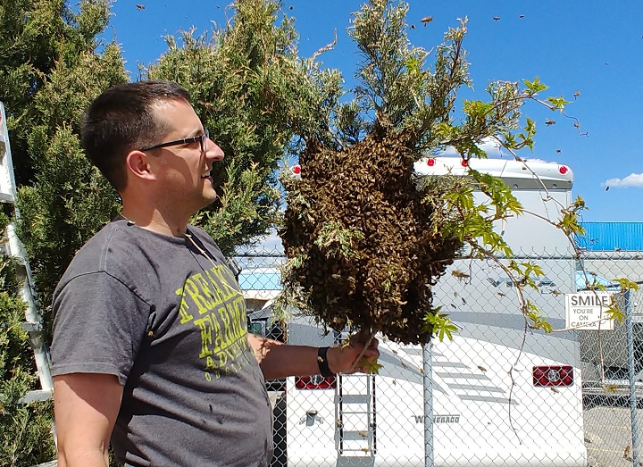 Okanagan beekeeper safely removes swarm of 20,000 bees — without a suitThe South Okanagan beekeeper estimated the swarm found at an RV dealership to be around 20,000 bees.EnvironmentMay 10, 2019