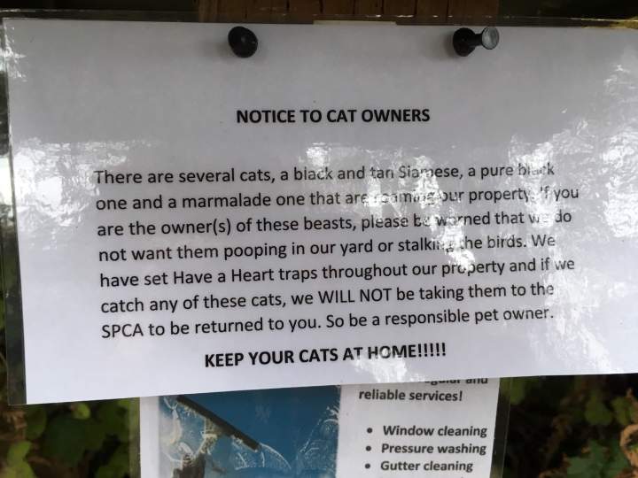 ‘They won’t be returned to you’: Warning note posted to cat owners’ mailbox in North SaanichCat owners in a North Saanich neighbourhood were disturbed recently to find a warning note about their pets posted on their mailbox.EnvironmentOct 30, 2020