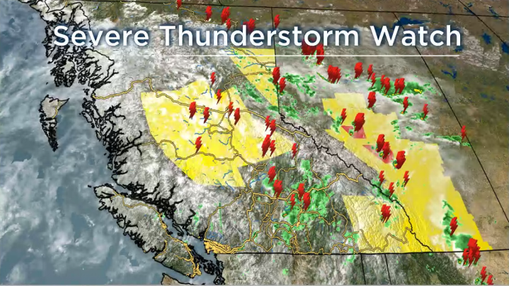 Severe thunderstorm watches issued for B.C.’s southeast, Central Interior regions‘Conditions are favourable for the development of severe thunderstorms that may be capable of producing strong wind gusts, large hail and heavy rain.’WeatherJul 7, 2022