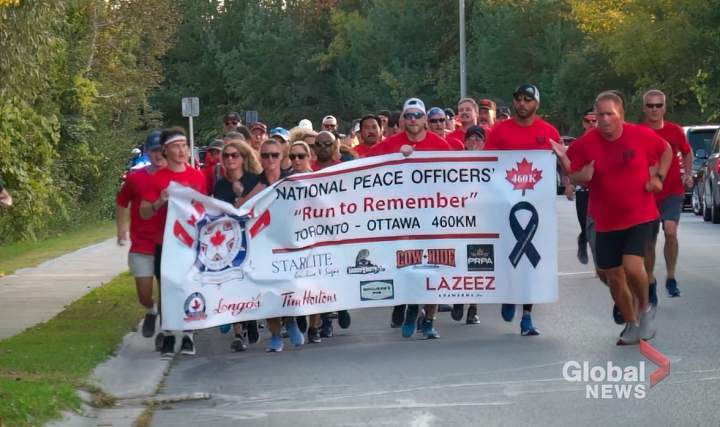 ‘Run to Remember’ makes stop at Chris Garrett Memorial Park in Cobourg, Ont.The three-day, 460-kilometre relay raises awareness of the Police and Peace Officers Memorial Service, which honours police and peace officers who have died in the line of duty.CanadaSep 22, 2023