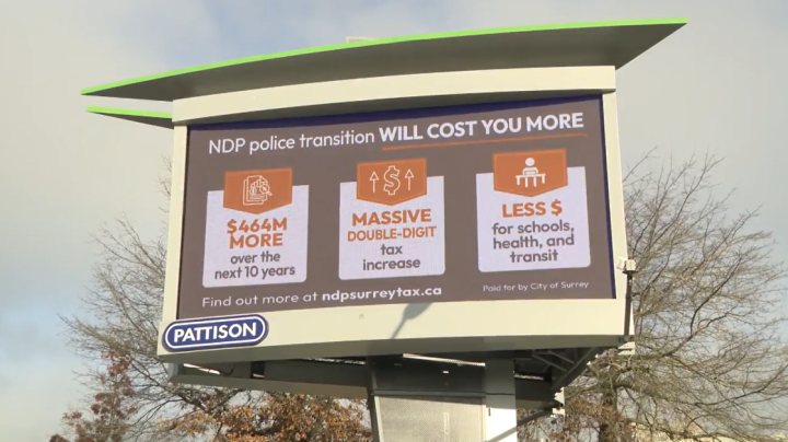 Surrey spending nearly $500K on campaign alerting public to cost of ‘NDP police transition’The billboards state that dismantling the Surrey RCMP in favour of a fully-fledged municipal police force will cost an additional $446 million over the next decade.PoliticsDec 12, 2023