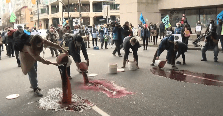 Climate activists dump fake blood in front of B.C. Supreme Court ‘to demand action’"We have to demand action to avoid total catastrophe. It's already started," said organizer Kiara Grant.EnvironmentFeb 27, 2021
