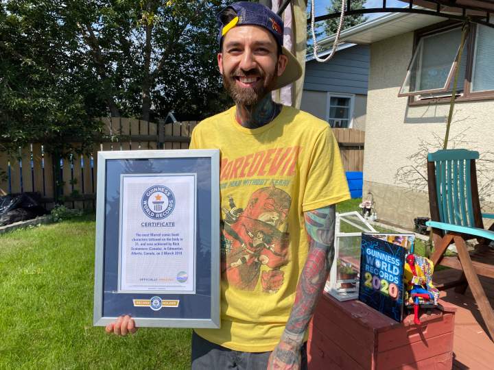 Edmonton man featured in Guinness World Record 2020 book for most Marvel tattoosThe Edmonton man has 34 Marvel comic characters tattooed on his body.CanadaJul 31, 2020