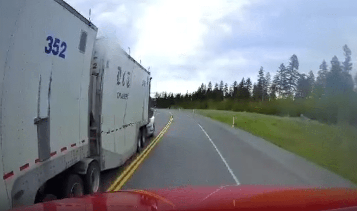 Commercial truck makes dangerous pass on busy highway in B.C.’s InteriorThe commercial truck, after rounding a corner, passes another semi on a short straight stretch, crossing over a double solid line to do so.TrafficDec 3, 2021
