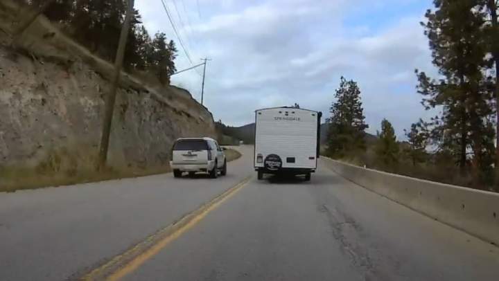 Dangerous pass on Westside Road caught on dashcamThe incident happened along a windy stretch, and involved a large SUV crossing over a double-solid line to pass two vehicles, including one hauling fifth wheel.TrafficApr 22, 2023