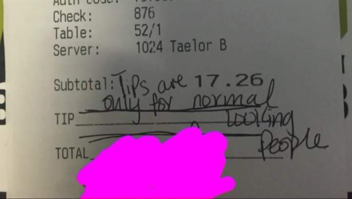 ‘Tips are for normal-looking people’: Server outraged after finding offensive message on receiptA waitress in Iowa is speaking out after a customer wrote the phrase "Tips are for normal-looking people" on a receipt instead of a tip.ConsumerMar 17, 2016