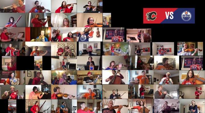 Battle of Alberta: Edmonton, Calgary orchestras unite to perform physically distanced ‘Hockey Night in Canada’Since sports are on hold during the COVID-19 pandemic, there is another way to get your Battle of Alberta fix.CanadaApr 11, 2020