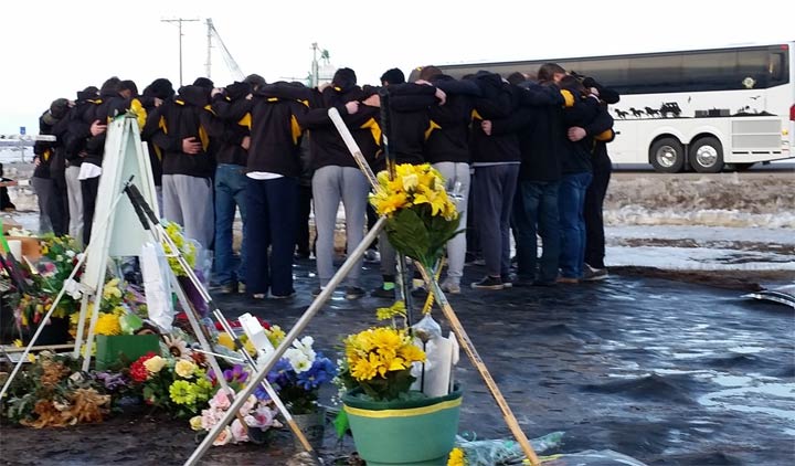 Estevan Bruins stop to pay respects at Humboldt Broncos bus crash siteThe Estevan Bruins hockey team stopped to pay their respects at the Humboldt Broncos bus crash site before resuming the SJHL playoffs.CanadaApr 14, 2018