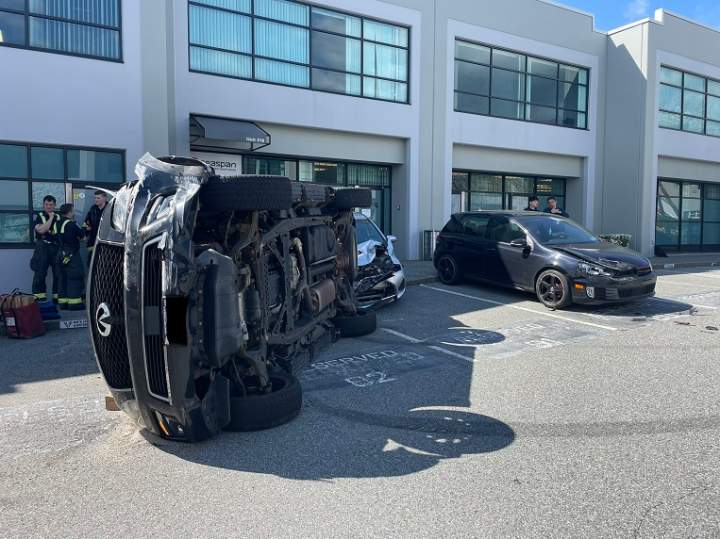 Suspected drunk driver flips vehicle after crashing into North Vancouver buildingAccording to police, the driver struck a building, then reversed, hit a parked vehicle, and flipped her own vehicle on its side.CrimeApr 26, 2023