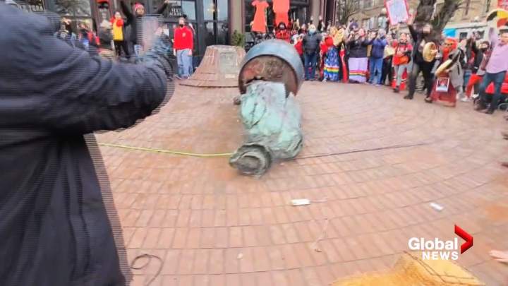 Gassy Jack statue in Vancouver’s Gastown toppled during women’s memorial march, video showsCritics have said Gassy Jack is a symbol of oppression against Indigenous people, noting he was 40 years old when he married a 12-year-old girl from the Squamish First Nation.CanadaFeb 14, 2022