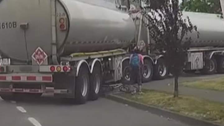 Dash cam shows gas tanker truck crushing cyclist’s bike while making a turn in VancouverThe video, taken on July 4, shows the gas tanker travelling on Rupert Street towards Superstore and the intersection with Grandview Highway.Jul 6, 2018