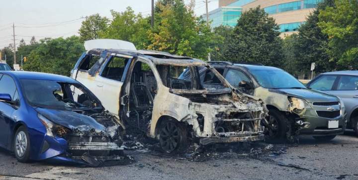 3 vehicles hit by fire in Stone Road hotel parking lot: Guelph policeGuelph police say three vehicles were found on fire at a Stone Road parking lot on Wednesday, including one fully engulfed in flames. The cause of the blaze is under investigation.CrimeAug 9, 2023