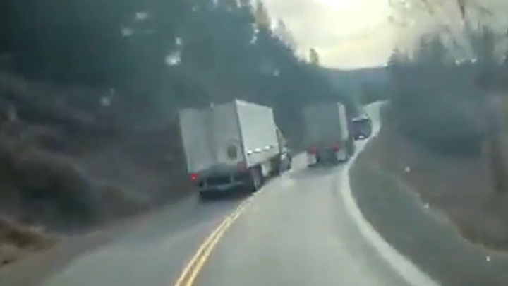Commercial truck makes dangerous pass on busy highway in B.C.’s InteriorThe commercial truck, after rounding a corner, passes another semi on a short straight stretch, crossing over a double solid line to do so.TrafficDec 3, 2021