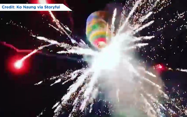 Video shows hot-air balloon filled with fireworks exploding above crowd in MyanmarNine people were injured after a hot-air balloon stuffed with fireworks exploded during a festival in Myanmar on Wednesday.TrendingNov 18, 2018