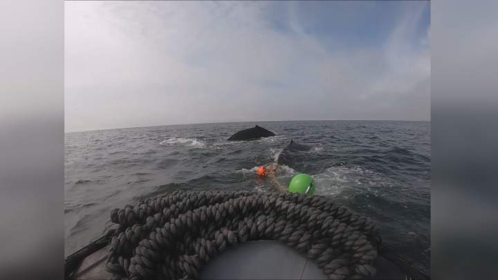 Video shows baby humpback whale freed from fishing gear off Vancouver IslandThe calf had "several wraps of line around the base of the tail and the flukes," the DFO said.Sep 12, 2019