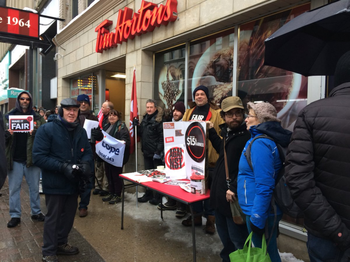 London labour activists gather outside Tim Hortons to protest benefit, paid break clawbacksProtesters gathered outside the Tim Hortons on Dundas at Richmond Wednesday to condemn some franchise locations' decision to cut paid breaks and employee benefits.EconomyJan 10, 2018