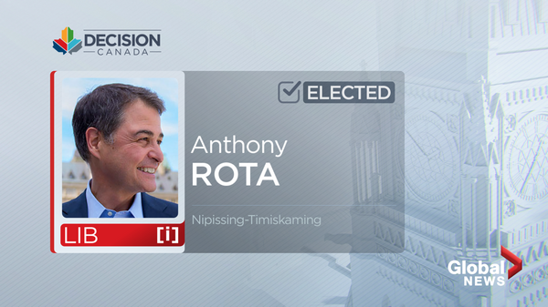 Liberal Anthony Rota wins in Nipissing-TimiskamingAnthony Rota resoundling recaptured his former riding of Nipissing-Timiskaming for the Liberals.Oct 20, 2015